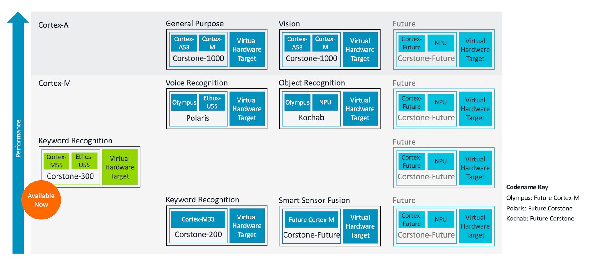 第一代 Arm 物聯網全面解決方案現已上市,適合通用運算與機器學習 (ML) 工作負載的使用場景,包括以機器學習為基礎的語音關鍵字辨識。它以 Corstone-300 子系統為基礎,結合 Arm 最具人工智慧功能的 Cortex-M 處理器 Cortex-M55,以及可設定、高效率的 microNPU Ethos-U55。